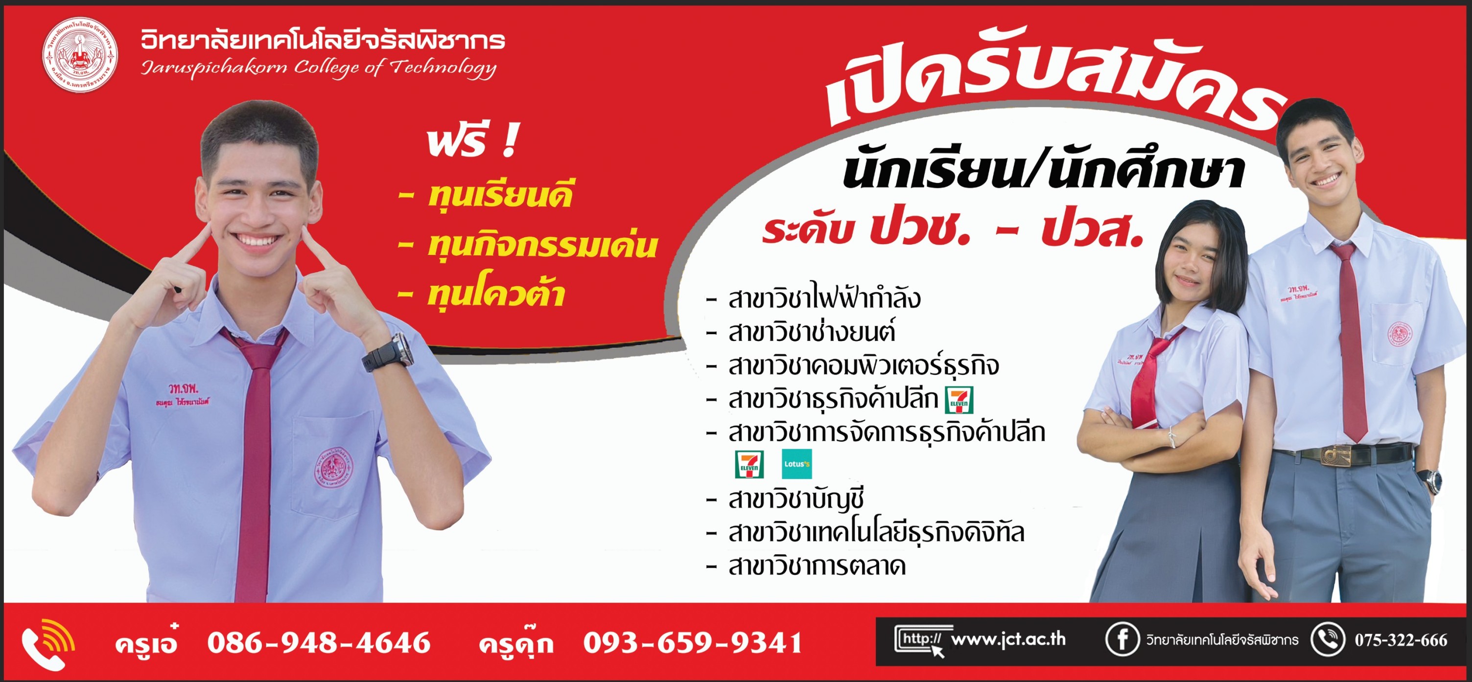 #วิทยาลัยเทคโนโลยีจรัสพิชากร รับสมัครนักศึกษา ในระดับ ปวช. และ ปวส. (ภาคเรียนที่ 2) ประจำปีการศึกษา 2566 เรียนเทอม 2 ไม่ต้องรอปีหน้า!!!! เลือกเวลาเรียน ปวช.(จ.-ศ.) เลือกเวลาเรียน ปวส.(จ.-ศ.) หรือ วันอาทิตย์ ผ่อนชำระค่าเล่าเรียนได้ กู้กองทุน กยศ. ได้ สมัครด้วยตนเองได้ที่วิทยาลัยฯ (ทุกวัน) หรือ ผ่านทางออนไลน์ได้ที่ Facebook : https://www.facebook.com/TechnoJarus/ สอบถามเพิ่มเติมได้ที่ : Tel : 075-322-666 , 086-948-4646 , 093-6599-341 #DEK66 #สมัครเรียน #นักศึกษาใหม่ #เรียนวันอาทิตย์ #สมัครเรียนปวช #เพิ่มทักษะ #อัพเกรดวุฒิ #วิชาชีพ #ทำงานด้วยเรียนด้วย #เรียนวันหยุด #จบแล้วมีงานทำ #สอบราชการได้ #กพ.รองรับ #เรียนจริงจบจริง #สมัครเรียนปวส #วิทยาลัยเทคโนโลยีจรัสพิชากร #JCT จำนวนผู้เข้าชม : 250